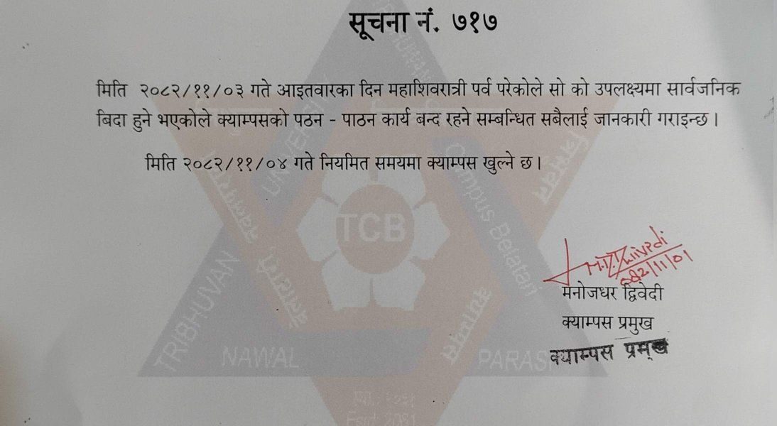 महाशिवरात्री विदा सम्बन्धमा । February 23, 2026 [email protected] notice 0 About Author Leave a Reply Cancel replyYour email address will not be published. Required fields are marked *CommentName Email Website Save my name, email, and website in this browser for the next time I comment.